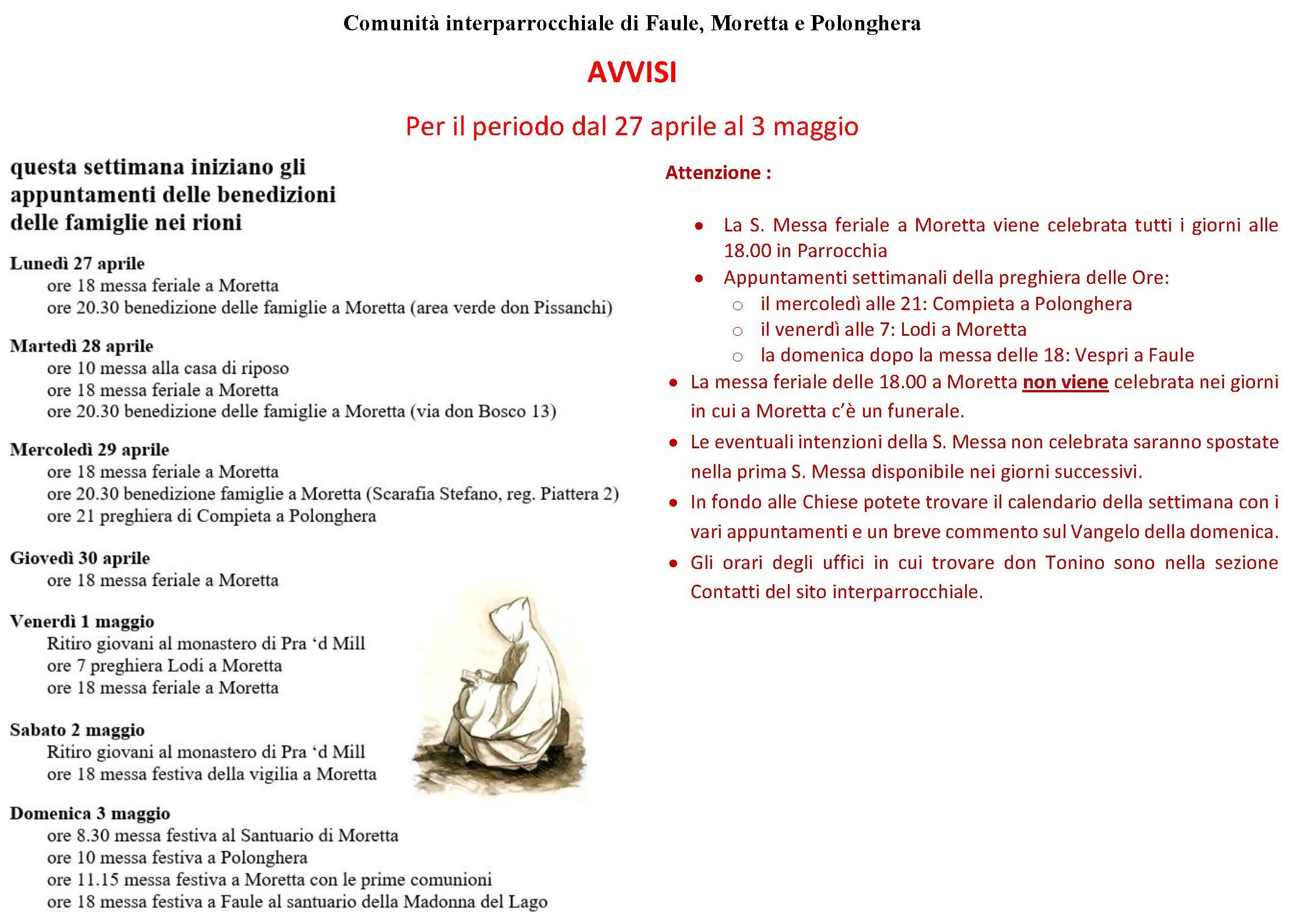 Nell'immagine sono riportati gli avvisi e le comunicazioni inerenti le iniziative e le funzioni nella settimana che va da lunedì 27 aprile a domenica 3 maggio 2026.