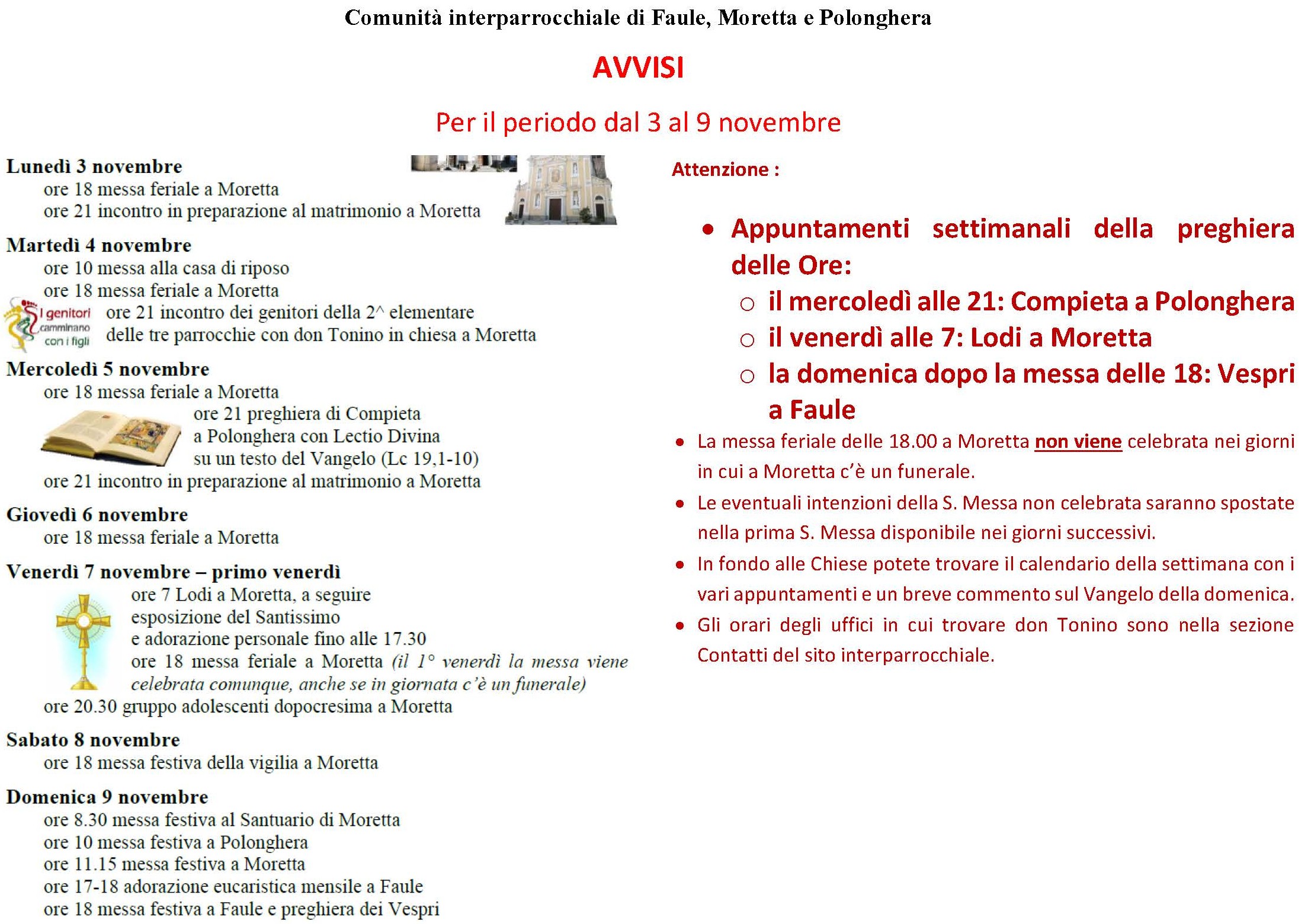 Nell'immagine sono riportati gli avvisi e le comunicazioni inerenti le iniziative e le funzioni nella settimana che va da lunedì 3 a domenica 9 novembre 2025.