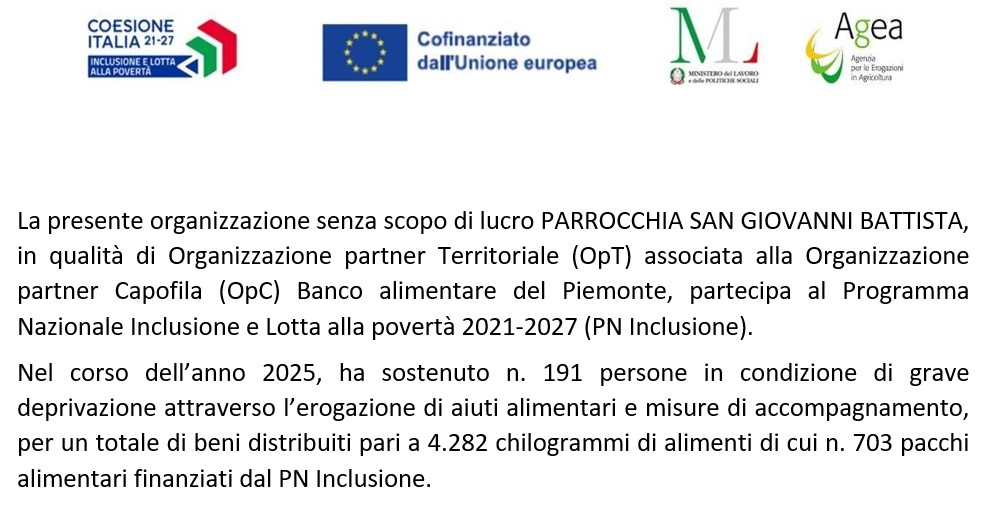 Gli aiuti in pacchi viveri ricevuti dal Banco Alimentare del Piemonte nel 2025 sono riportati nell'immagine.