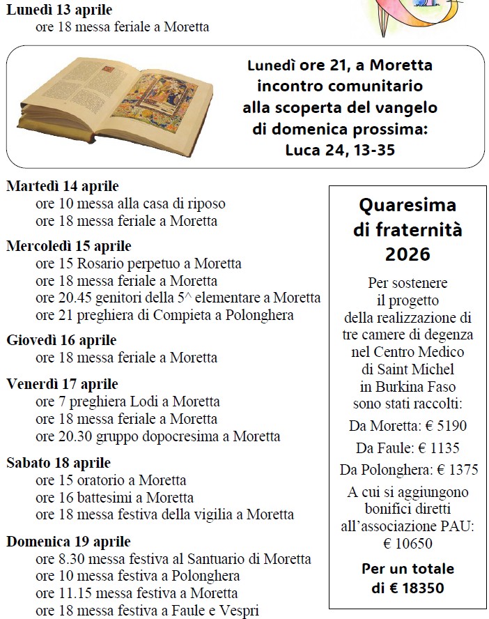 Nell'immagine sono riportati gli avvisi e le comunicazioni inerenti le iniziative e le funzioni nella settimana che va da lunedì 13 a domenica 19 aprile 2026.