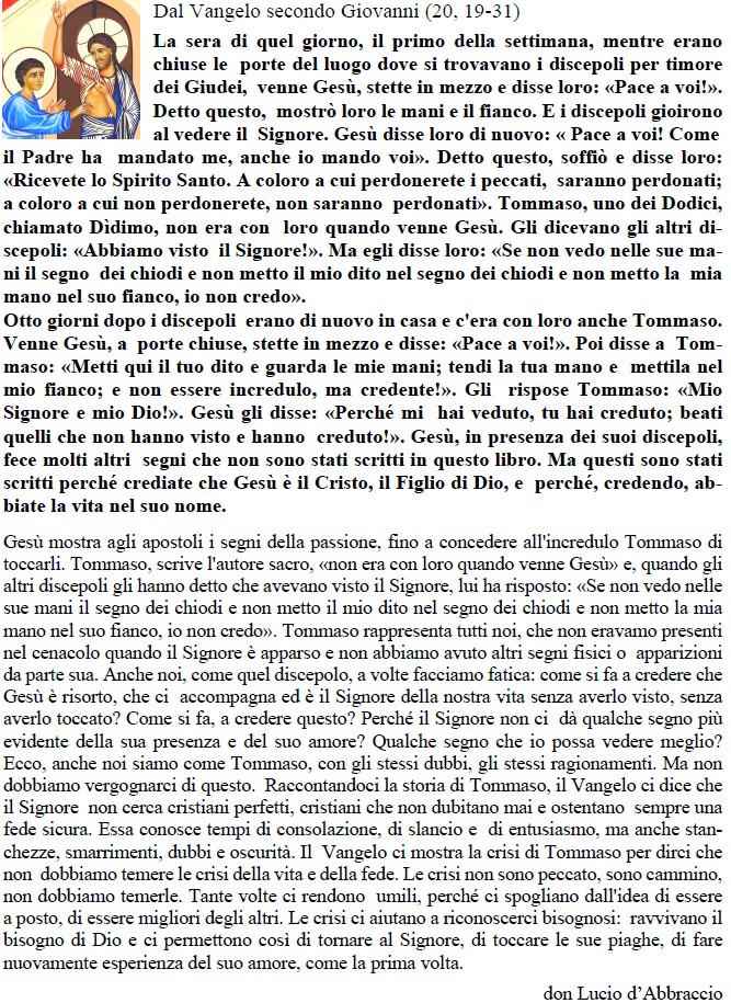 COMMENTO AL VANGELO DI DOMENICA 12 APRILE 2026 - II DOMENICA DI PASQUA O DELLA DIVINA MISERICORDIA