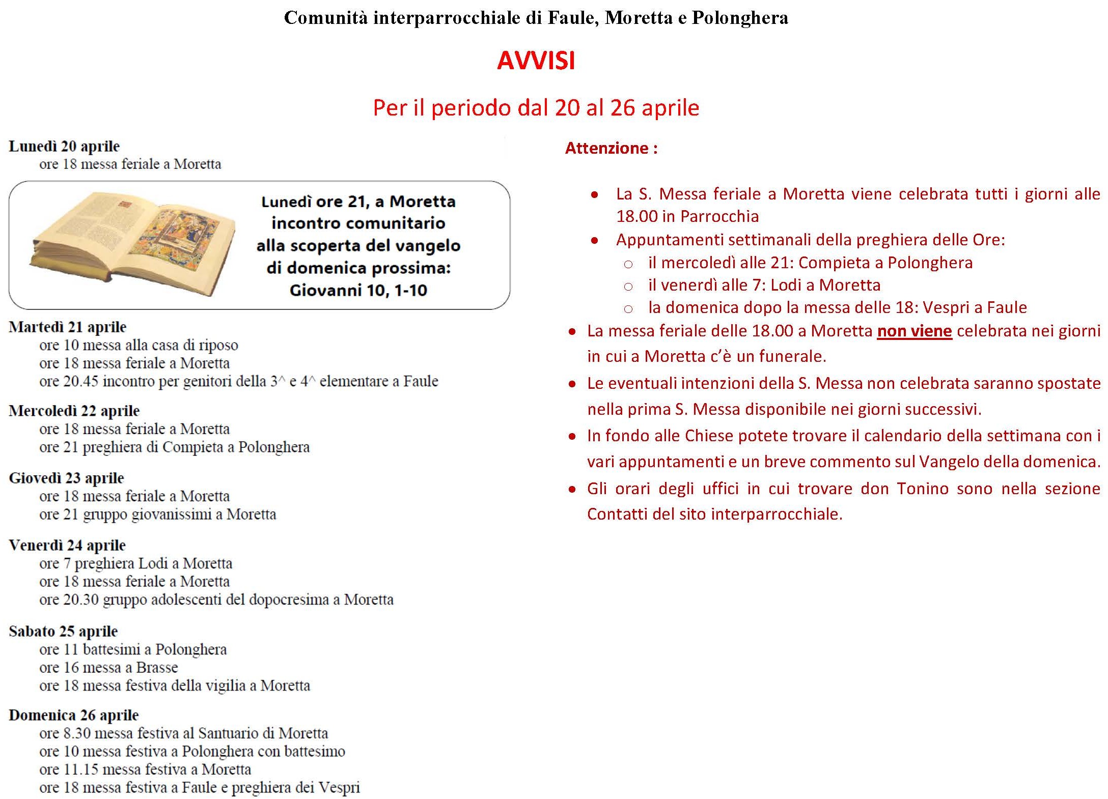 Nell'immagine sono riportati gli avvisi e le comunicazioni inerenti le iniziative e le funzioni nella settimana che va da lunedì 20 a domenica 26 aprile 2026.